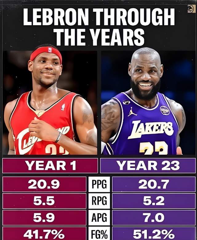 今日美媒公布了一组关于勒布朗·詹姆斯的数据对比:18岁的詹姆斯vs41岁的詹姆斯。