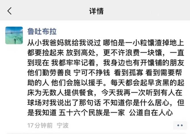 在救护车上一边接受治疗,一边拿起手机发文声讨李祥波的鲁吐布拉表示:从小我爸妈就给我说过,哪怕是一小粒馕渣掉地上都要捡起来,放到高处,更不许浪费一块馕,一直到现在我都牢牢记着,我身边也有开馕铺的朋友,他们勤劳善良,宁可不挣钱,看到孤寡,看到需要帮助的人,他们会施以援手。每天都会起早贪黑的起床为无数人提供餐食,今天我再一次听到有人在球场对我说出了那句话,不知道你是什么居心,但是我知道五十六个民族是一家,公道自在人心。